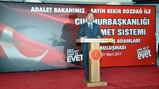 Daha sonra Nevşehir Hacı Bektaş Veli Üniversitesi'nde esnaf, sanayici ve sivil toplum kuruluşu temsilcileriyle bir araya gelen Bozdağ, buradaki konuşmasında, Türk devleti ve milletini yok etmek için çalışan örgütler ile onları besleyen güçlere karşı, ülkenin sisteminde değişiklik yapılmasının gerekli olduğunu söyledi.