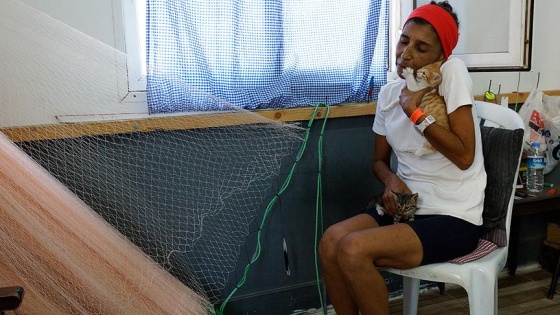Kursa gittiği günlerde de hayvanları yanından ayırmayan Durualp, doğumdan sonra ayaklarında güç kaybı oluşan isimlerini Miço ve Tayfa koyduğu yavru kedilerle balık ağı örmeyi sürdürüyor.