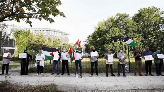 BAE’nin Berlin Büyükelçiliğinin önünde toplanan onlarca kişi, Abu Dabi ile Tel Aviv arasındaki normalleşme anlaşmasına tepki göstererek, BAE aleyhine slogan attı.
