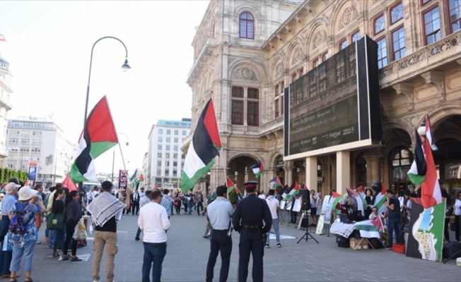 Viyana Devlet Opera binasının önünde toplanan göstericiler, Filistin bayraklarının yanı sıra “Özgür Filistin”,” İşgal 70’dır sürüyor” yazılı pankartlar açtı.