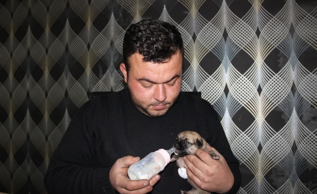Arkadaşlarıyla merak ederek sesin geldiği tarafa gittiklerini anlatan Uflaz, "Köpek yavrusu bulduk. İlk başta dikkat etmedik, ayağının bu şekilde kesik olduğuna. Sonradan elimize aldık bunun annesi nerede diye bakındık, annesi yok. Elimize aldığımızda ayağının, kuyruğunun kesik olduğunu gördük. Gezintiyi bıraktık, hemen veteriner hekime geldik. Veteriner arkadaşlar ilgilendi, ayaklarının, kuyruğunun pansumanını yaptılar. Dükkanıma getirdim, dükkanımda bakıyorum, üç gündür bende. Biberon aldık, sütle beraber. Biberonuyla birer saat arayla karnı doyana kadar veriyoruz. Karnı doydu mu uyumaya geçiyor. İş yerimde yuvasını yaptım. Sürekli sıcak tutuyorum, bakıyorum" dedi.