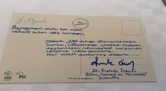 AK Parti Düzce Milletvekili, Bilim Sanayi ve Teknoloji Bakanı Faruk Özlü, Başbakan Binali Yıldırım ve Bakanlar Kurulu üyeleriyle birlikte Doğu ve Güneydoğu’da görev yapan güvenlik güçleriyle ailelerine Bayram tebrik kartı gönderdi.