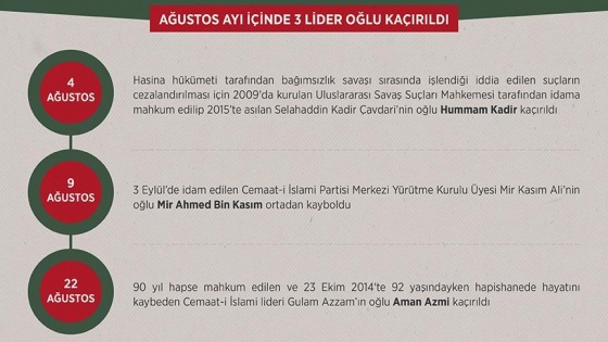 Bangladeş te önce Uluslararası Savaş Suçları Mahkemesi tarafından idama mahkum edilen ve 2015 te de asılan Selahaddin Kadir Çavdari nin oğlu Hummam Kadir, 4 Ağustos ta kaçırıldı. Kadir in kaçırılmasından 5 gün sonra 9 Ağustos ta bu kez Cemaat-i İslami nin geçen hafta idam edilen lideri Mir Kasım Ali nin oğlu Mir Ahmed Bin Kasım ortadan kayboldu.