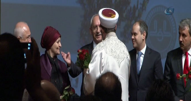 Programın bitmesinin ardından Diyanet İşleri Başkanı Mehmet Görmez, sahnede protokol üyelerine gül dağıttı. Cumhurbaşkanı Erdoğan ve eşi Emine Erdoğan’a gül veren Başkan Mehmet Görmez, daha sonra Başbakan Davutoğlu’na yöneldi. Bunun üzerine Davutoğlu, Görmez’e Kılıçdaroğlu’nu işaret ederek önce ona vermesini istedi. Başkan Görmez, bu sefer Kılıçdaroğlu’na yönelince de Kılıçdaroğlu, Başbakan’ın bu jestine karşılık aynı jesti yaparak hayır önce Sayın Başbakan’a verin dedi. Görmez’de önce Davutoğlu ve eşi Sare Hanım’a ardından da Kılıçdaroğlu’na gül verdi.