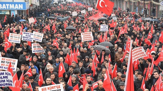 Batman'da düzenlenen "Teröre Lanet Kardeşliğe Davet" yürüyüşüne katılanlar ellerinde Türk bayraklarıyla terör örgütleri PKK, DEAŞ, FETÖ, DHKP-C ile hain saldırılarını protesto etti. - Anadolu Ajansı