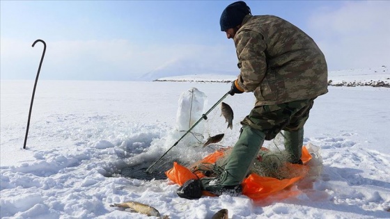Bir yandan ağı çeken bir yandan da ağa takılan balıkları heyecanla bekleyen balıkçıların zaman zaman kaş ve kirpikleri de kırağı tutuyor. Binbir zahmetle buzla kaplı gölden çıkardıkları balıkları çuvallara dolduran balıkçılar, havanın kararmasıyla evlerine dönüyor.