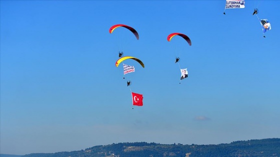 Çanakkale semalarında motorlu yamaç paraşütü ile gösteri yapan pilotlar, Türk bayrağı ve Atatürk resimleri taşıdı.