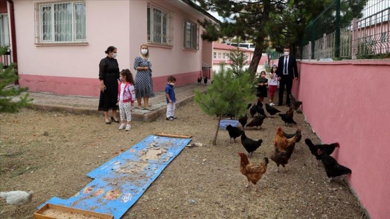 Bahçesinde tavuk ve köpekler bulunan, hobi bahçesinde ise domates, salatalık ve biber yetiştirilen okulda, çocuklar sayıları, şekilleri, renkleri ve nesneleri dokunarak öğrenme fırsatı buluyor.