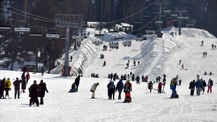 Kars'ın Sarıkamış ilçesindeki sarıçam ormanları arasında, uzun ve alternatif kayak pistleriyle ilgi çeken kayak merkezine gelen kayakseverler, kayak ve snowboard yaparak kızakla kayma imkanı buluyor.