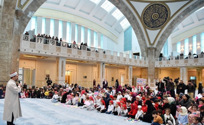Diyanet İşleri Başkanı Ali Erbaş, “Cami Çocuk Buluşması” kapsamında Ahmet Hamdi Akseki Camii’nde çocuklarla bir araya geldi. Ankara’da 4-6 grubu yaş Kur’an kurslarında eğitim gören çocukların katıldığı programda konuşan Erbaş, "Bizim ilerde değerlerimizi emanet edeceğimiz en önemli varlığımız çocuklarımızdır. Çocuklarımız Allah, Peygamber, Kur’an-ı Kerim ve vatan sevgisiyle yetişsin istiyoruz" şeklinde konuştu.