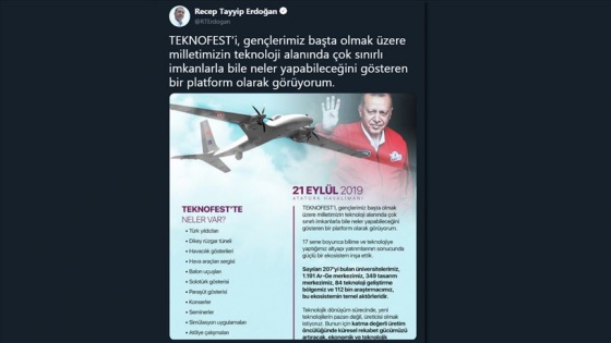 TEKNOFEST’i, gençlerimiz başta olmak üzere milletimizin teknoloji alanında çok sınırlı imkanlarla bile neler yapabileceğini gösteren bir platform olarak görüyorum. pic.twitter.com/dy0TqK9BES— Recep Tayyip Erdoğan (@RTErdogan) 21 Eylül 2019Erdoğan, paylaşımında TEKNOFEST'i, gençler başta olmak üzere milletin teknoloji alanında çok sınırlı imkanlarla bile neler yapabileceğini gösteren bir platform olarak gördüğünü belirtti.