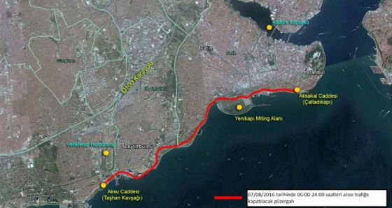Demokrasi ve Şehitler Mitingi’nin 7 Ağustos 2016 tarihinde Yenikapı miting alanında yapılacak olmasından dolayı 06.00-24.00 saatleri arasında Bakırköy Aksu Caddesi (Taşhan Kavşağı) ve Fatih ilçesi Aksakal Caddesi arasında kalan sahil yolu geçici olarak trafiğe kapatılacak.