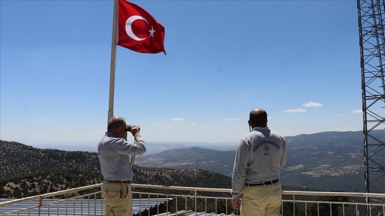 Denizli ve Afyonkarahisar arasındaki geniş bölgeyi görüş alanının içine alan 1630 rakımlı kulede sırayla gündüz ve gece mesai yapan baba oğul, 24 saat dürbünle gözetleme yapıyor.