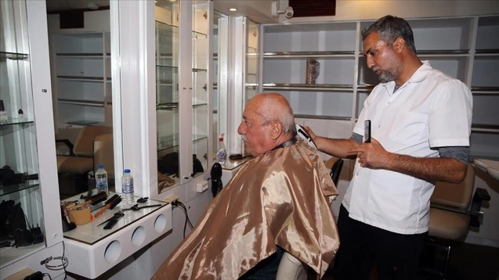 Gemiye 6 yaşındaki kızının kalp rahatsızlığı nedeniyle ailesiyle kabul edilen berber Yunus Kutuku, kendisi gibi gemide kalan depremzedelerin saç kesimlerini ücretsiz yapıyor.