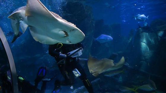 Çeşitli cinste vatoz, köpek balığı, barakuda gibi tehlikeli türlerin de bulunduğu devasa tanka günlük olarak daldıklarını anlatan Uğur, "Vatozlarımızı elle besliyoruz. Vatozlarımız kuyruklarındaki iğnelerden dolayı tehlikeli canlılar. Sandbar denilen kum köpek balıklarımızı da aynı şekilde elle besliyoruz. Yine çok büyük olan kaplan köpek balıkları da var. Bunları haftada 2 defa, elle besliyoruz. Elimizi kapmasın diye koruyucu eldivenler ve ekipmanlar kullanıyoruz." dedi.
