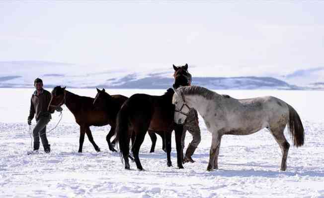 Ardahan'da da Çıldır Gölü çevresi kar yağışıyla beyaza büründü.
