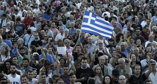 Yunanistan’da AB ve Euro Bölgesi yanlısı vatandaşlar, dün akşam Atina’daki parlamento binası karşısında bulunan Sintagma Meydanı’nda hükümet karşıtı protesto düzenledi. Ülkenin AB’de kalmasını isteyen vatandaşlar, bu yöndeki isteklerini belirten sloganlar atarak pankartlar açtı. Hükümetin uluslararası kreditörler ile anlaşmaya varmak için girdiği müzakerelerde izlediği politikayı protesto eden göstericiler, borç krizine bir an önce bir çözüm yolu bulunarak Yunanistan’ın AB ve Euro Bölgesi’ndeki yerinin güvence altına alınmasını istedi.