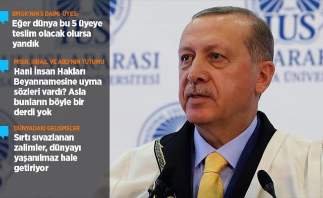Kimisi ağır, 2 bin 700 Filistinli sivilin yaralanmasını basit birkaç kınama cümlesiyle savuşturulmaya çalışıldığına dikkati çeken Erdoğan, "Kendilerine dedim ki 'Bunları bize verin, biz bunların tedavisini yaptıralım.' Vermediler. Veremeyiz dediler. Kim bunlar? Mısır. Kim bunlar? İsrail. Kim? Amerika. Hani bunların İnsan Hakları Beyannamesi'ne saygıları vardı. Hani İnsan Hakları Beyannamesi'ne her zaman harfi harfine uyma sözleri vardı. Yok, inanmayın bunlara. Asla bunların böyle bir derdi yok." diye konuştu. "BMGK'nin 5 üyesine dünya teslim olacak olursa yandık" Onun için "Dünya 5'ten büyüktür" dediğini hatırlatan Erdoğan, "Birleşmiş Milletler Güvenlik Konseyinin bu beş üyesine dünya teslim olacak olursa yandık. Beş değil bir ülke 'evet' derse tamam, 'hayır' derse yok. Böyle bir şey olur mu? Artık dünya İkinci Dünya Savaşı şartlarını yaşamıyor. Onlar artık geride kaldı. Şimdi yeni bir dünya var. Yeni bir dünya kuruluyor. Dolayısıyla bu yeni dünyayı 196 tane Birleşmiş Milletler Genel Kurulu üyesi yeniden inşa etmek durumundadır. Bunu da görüyoruz." değerlendirmesinde bulundu. "13 Aralık Kudüs ile ilgili attığımız bir adım vardı. Olayı ne yaptık? Birleşmiş Milletlere getirdik ve Birleşmiş Milletlerde hemen süratle bir oylamaya gidildi." diyen Cumhurbaşkanı Erdoğan, sözlerini şöyle sürdürdü: "Yapılan oylama neticesinde 128 ülke, Amerika'nın da içinde olduğu 9 ülkeye ne dedi? 'Hayır, reddediyoruz' dediler ve 129 ülke Amerika'yı ve yandaşlarını tanıyan, ki isimlerini ben hiç bunların bilmem, duymadığım, bilmediğim. Bunlara ülke demek mümkün değil, olsa olsa kasabadır. Bir Amerika'nın adını biliyoruz, bir İsrail'in adını biliyoruz. O da çok zulmettiği için. Başını kuma gömen deve kuşu misali İsrail'in şiddet politikalarına karşı gözlerini kapattıklarında sanki bunların hiç yaşanmadığını varsayıyorlar. Kendi konforlu dünyalarını güvende tutarak bu süreci idare edebileceklerine inanıyorlar. Oysa hakikati görmezden gelmek mümkün değildir. Bugün siz kabul etmeseniz de Filistinliler kurşunların hedefi olmaya, çocuklarını kaybetmiş annelerin, annelerini kaybetmiş çocukların feryatları yükselmeye devam ediyor. Siz sırtınızı dönseniz de bugün dünyada milyonlarca insan açlık ve kıtlığın pençesinde hayatta kalma mücadelesi veriyor. Sürekli sırtı sıvazlanan zalimler, dünyayı hepimiz için yaşanılmaz hale getiriyor. Onun için diyoruz ki, zalimler için yaşasın cehennem." "Mesele karanlığı delecek bir umut ışığı yakabilmektir" Bu adaletsizliklerin, bu zulümlerin hepsi şu an dünyanın farklı köşelerinde yaşandığını ifade eden Erdoğan, "Bize düşen, beise düşmek, dağılmak, kendi kabuğumuza çekilmek yerine, hak ve adaletin tecellisi için cesaretle mücadele etmektir. Karanlığa kızmanın hiç kimseye bir faydası yoktur, olmayacaktır. Mesele karanlığı delecek bir umut ışığı yakabilmektir." dedi. Bunun için bakılacak yerin güç sahiplerinin cüsseleri değil, kendi yüreklerindeki inanç olması gerektiğini ifade eden Erdoğan, "Kibir abidelerinin tehditlerine boyun eğerek, coğrafyamızı kana bulayan şiddet sarmalına sessiz kalarak, geleceğimize umutla bakamayız. Hazreti Ali Efendimiz, 'Haksızlık önünde eğilmeyiniz. O zaman hakkınızla birlikte şerefinizi de kaybedersiniz' buyuruyor." diye konuştu. "Tüm imkanları kullanarak çözüm için çalışıyoruz" Hangi inançtan, hangi dinden olursa olsun vicdan ve şahsiyet sahibi insanlar bırakın haksızlık karşısında boyun eğmeyi tam tersine seslerini yükseltmesi, tepkilerini net bir şekilde ortaya koyması gerektiğini vurgulayan Erdoğan, "Türkiye olarak biz son 16 yıldır işte bunu yapmaya çalışıyoruz. Coğrafyamızı etkileyen hadiseleri tribünden seyretmek yerine elimizdeki tüm imkanları kullanarak çözüm için çalışıyoruz. Neme lazımcılığı sahte konforuna tenezzül etmeden aktif ve girişimci bir dış politika takip ediyoruz." açıklamasını yaptı. Erdoğan, İstanbul'da geçen hafta gerçekleşen Olağanüstü İslam Zirvesi'nin bu çabanın örneklerinden biri olduğunun altını çizerek, şunları söyledi: "Bu zirveyi, Amerikan yönetiminin hukuk dışı kararından ve İsrail katliamlarından sadece 72 saat sonra liderler düzeyinde düzenledik. Böylece zulüm karşısında tepkimizi gösterdik. Hem de Kudüs başta olmak üzere kutsallarımıza sahip çıkma konusunda güçlü bir irade sergiledik." "Filistinlilerin kanını dökenlerin canını acıtacak karar aldık" İslam İşbirliği Teşkilatı olarak ekonomik, diplomatik, ticari ve siyasi alanda Filistinlilerin kanını dökenlerin özellikle canını acıtacak birçok karar aldıklarını belirten Erdoğan, şöyle devam etti: "Müslümanların ilk kıblesi, üç semavi dinin mukaddes yeri Kudüs'tür. İsrail tarafından işgal edilmesine fırsat vermeyeceğimizi bir kez daha ilan ettik. Gerek 13 Aralık'ta gerekse 18 Mayıs'ta yapılan Kudüs konulu olağanüstü zirveler İslam dünyasının bu konudaki kararlılığının iradesidir. Bu zirveler aynı zamanda İslam dünyasının üzerine serpilmiş ölü toprağını yavaş yavaş üzerinden atmaya başladığının da işaretleridir. Bunu geleceğimiz adına atılmış son derece ümitvar bir adım olarak görüyorum. Benzer bir dayanışmayı Suriye'den Irak'a, İslam düşmanlığından kültürel ırkçılığa kadar diğer sorunlarımız konusunda da göstereceğimize inanıyorum. Nitelikli, iyi yetişmiş, değerlerini özümsemiş, ufku açık, vizyonu geniş bir insan kaynağına sahip olmadan bu çabalarımızın çoğu akim kalmaya mahkumdur. Ülkemiz, milletimiz ve işte bugün Bosna Hersek'te olduğu gibi kardeşlerimiz için müreffeh bir gelecek inşa etmek konusunda biz gençlerimize güveniyoruz." Bu anlayışla genç