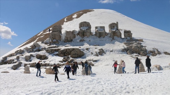Yolun açılmasıyla özlenen güneşli günleri fırsata çeviren yerli ve yabancı turistler, Nemrut Dağı'nda karlar altındaki heykellerin bolca fotoğrafını çekti.