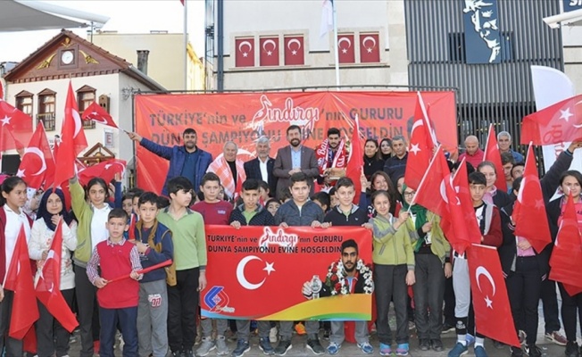 Sındırgı Cumhuriyet Meydanı'nda düzenlenen törende milli sporcu için "Türkiye'nin ve Sındırgı'nın gururu dünya şampiyonu evine hoş geldin" yazılı pankart açıldı.