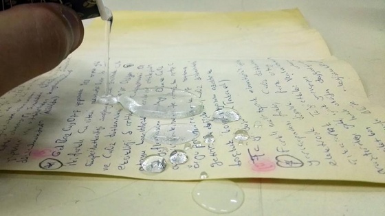 Mürekkep kalemle üzerine yazı ve karalamaların yapıldığı kağıtta ise suyun işlemediği görüldü. Kağıdın yüzeyinde ve yazılarda herhangi bir dağılma ve bozulma yaşanmadı.