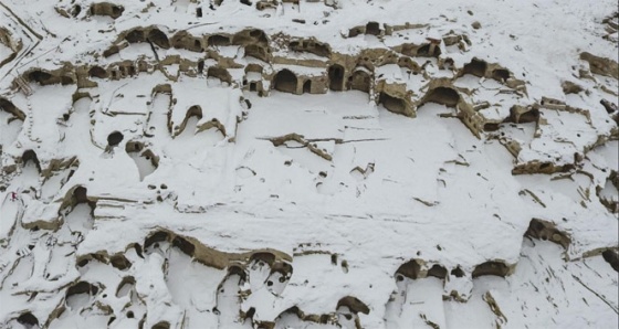 Nevşehir’de dün öğleden sonra başlayan kar yağışı nedeniyle 113 metrelik bir yükseltiye sahip dünyanın en büyük yeraltı şehri de beyaza büründü. Nevşehir Belediyesinin maddi destekleri ile arkeolojik araştırma ve temizleme çalışmalarının devam ettiği Nevşehir Kalesi civarında 2014 yılında bulunan dünyanın en büyük yeraltı şehrinin, havadan çekilen fotoğraflarında beyaz bir örtü ile kaplandığı görülüyor.