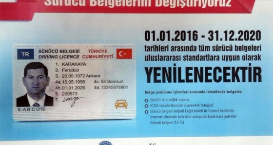 1 Ocak 2016 tarihinden itibaren ehliyette yeni dönem başlıyor. Karayolları Trafik Yönetmenliği’ndeki değişikliğin ardından mevcut sürücü belgeleri, 1 Ocak 2016 tarihinden itibaren 31 Aralık 2020 tarihine kadar yeni tip sürücü belgeleri ile değiştirilecek. Yeni tip sürücü belgeleri, uluslararası niteliğe sahip olacak ve diğer ülkelerde de geçerli olacak. Yeni tip sürücü belgelerinin geçerlilik süreleri ise minibüs, otobüs, kamyon ve çekici sınıfları için 5 yıl, motosiklet, otomobil, traktör ve iş makinesi sınıfları için 10 yıl olacak. İlk defa sürücü belgesi alanlar ile herhangi bir sebeple sürücü belgesi iptal edilmiş olup da yeniden sürücü belgesi alanlar, belgenin alındığı tarihten itibaren 2 yıl süreyle “aday sürücü” olarak kabul edilecek.