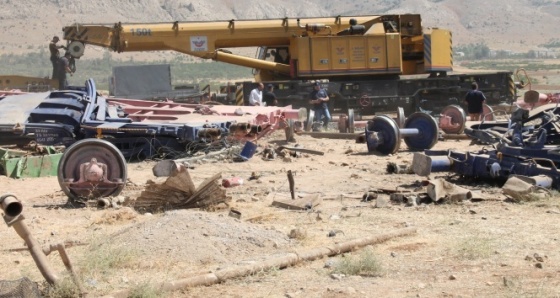 Enkazın durumu ortaya çıktı Savcı ve olay yeri inceleme ekiplerinin gece yarısı işleri tamamlamasının ardından sabah erken saatlerde Devlet Demir Yollarına bağlı ekipler, enkaz kaldırma çalışmasına başladı. Gün ışıyınca kazanın büyüklüğü de ortaya çıktı. Demir cevheri madeni yüklü trenin raydan çıkmasıyla meydana gelen kazada, tüm vagonların parçalanması dikkat çekti. 1 lokomotif ve 9 vagonun hurdaya döndüğü kaza yerinde vinç yardımı ile olay enkaz kaldırma çalışmaları yapılıyor. Hurdaya dönen tren, tır ve olay yerine getirilen diğer boş vagonlara yüklendi. Geçici olarak duran tren seferlerinin yeniden başlatılması için ise bozulan raylar kaldırılarak yenileri yerleştirildi.