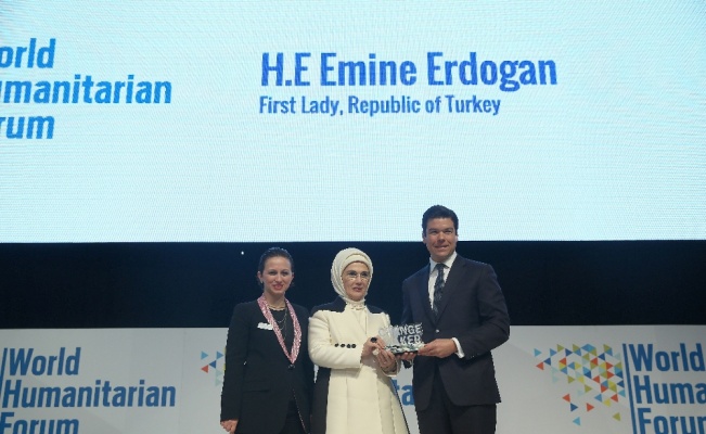 Cumhurbaşkanı Recep Tayyip Erdoğan’ın eşi Emine Erdoğan’a, World Humanitarian Forum (Dünya İnsani Forumu) tarafından Changemaker (Farkındalık Oluşturanlar) ödülü verildi. Erdoğan, "Bu ödülü, ağlayan bir çocuk gördüğünde yüreği kabaran, yabancıya kuşkuyla değil Tanrı misafiri diye bakan cömert Türk halkı adına kabul ediyorum" dedi.
