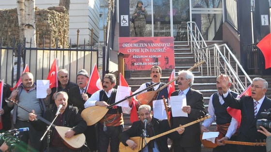 Erzurum Aşıklar ve Şairler Derneği üyeleri, sazları ve Türk bayraklarıyla, Erzurum Asker Alma Bölge Başkanlığı önünde bir araya geldi.