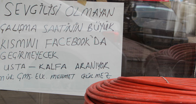 Erzurum'da bir elektrik dükkanının kapısında asılı olan “Sevgilisi olmayan, çalışma saatinin büyük kısmını Facebook’ta geçirmeyecek usta, kalfa aranıyor” yazılı iş ilanı görenleri hem güldürüyor hem de düşündürüyor.