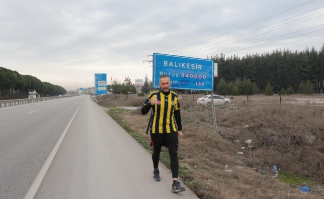 Balıkesir’de bir gece dinlenen Fenerbahçe fanatiği Rıza Martaş sabah saatlerinde ısınma hareketlerini yaparak İzmir’e doğru koşusuna devam etti.