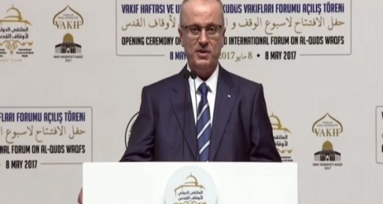 Vakıf Haftası ve Uluslararası Kudüs Vakıfları Forumu, Haliç Kongre Merkezi’nde düzenlenen açılış töreni ile başladı. Açılış törenine Cumhurbaşkanı Recep Tayyip Erdoğan’ın yanı sıra Ürdün Prensi Gazi Bin Muhammed, Filistin Devlet Başkanı Rami Hamdallah ve İslam İşbirliği Teşkilatı Genel Sekreteri Yusuf bin Ahmed el-Useymin de katıldı. Törende bir konuşma yapan Filistin Başbakanı Hamdallah, Kudüs’te yaşayanların zor durumda olduklarını söyledi. Hamdallah, “Kudüs’te ezanların okunması ve çanların çalması, hoşgörüyle yaşamın en yücesel örneğidir. Ancak şimdi Müslümanlar değil, Hristiyanlar da zulüm altındadır. Biz Hristiyan kardeşlerimize de destek vermekteyiz. İsrail 1967 yılında işgal ettiğinden beri Kudüs’ün yapısını değiştirmek için elinden geleni yapmaya devam etmektedir. Tarihi, mimari ve kültürel yapısını da bozmaktadır. Orada yaptıkları yıkımlar ve utanç duvarıyla demografik yapısını değiştirmeye çalışmaktalar. Kudüs’te yaşayan kişilerin tahammül sınırları fazlasıyla aşılmıştır. Biz alınan uluslararası kararların uygulanmasını beklemekteyiz” dedi.