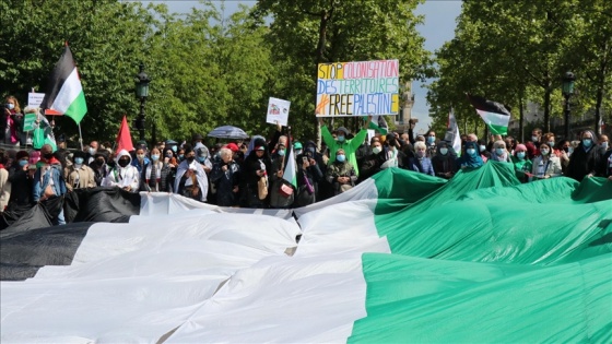 Fransa Filistin'le Dayanışma Derneğinin çağrısıyla başkentteki Republique Meydanı’nda toplanan binlerce kişi "İsrail katil, Macron suç ortağı", "Filistin yaşayacak, muzaffer olacak" sloganları attı.
