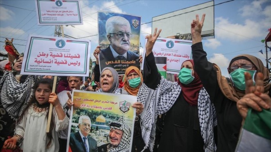 Ellerinde bayraklar, posterler ve pankartlar taşıyan Filistinli kadınlar, ilhak planına karşı sloganlar atarak Filistinlileri birlik olmaya davet etti.
