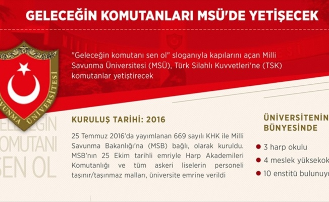 İSTANBUL (AA) - "Geleceğin komutanı sen ol" sloganıyla kapılarını açan, Başbakan Binali Yıldırım'ın katılacağı törenle de akademik yıl açılışı gerçekleştirilecek Milli Savunma Üniversitesi (MSÜ), Türk Silahlı Kuvvetleri'ne komutanlar yetiştirecek.