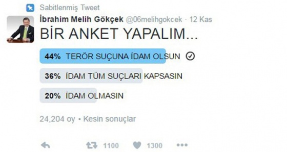 15 Temmuz darbe girişiminin ardından gündeme gelen “idam geri gelsin” talebine ilişkin Gökçek’in Twitter hesabından düzenlediği ankete 24 bin 240 kişi katılarak oy kullandı. Anket sonuçlarına göre, “Terör suçuna idam olsun” seçeneği yüzde 44, “İdam tüm suçluları kapsasın” seçeneği yüzde 36, “İdam olmasın” seçeneği ise yüzde 20 oy aldı.