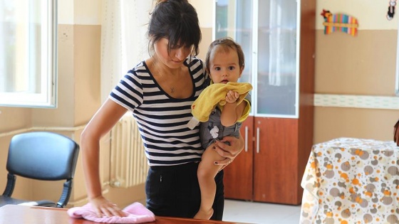 Okulda rehber öğretmen olarak görev yapan Sinem Yaşar da temizlik çalışmasına kucağındaki 11 aylık bebeğiyle katıldı.
