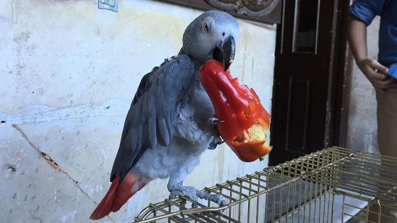 Şanlıurfa'da kafe-restoran olarak hizmet veren bir mağarada çalışanların baktığı Jako türü "Paşa" adlı papağanın isotla beslenmesi müşterilerin de ilgisini çekiyor.