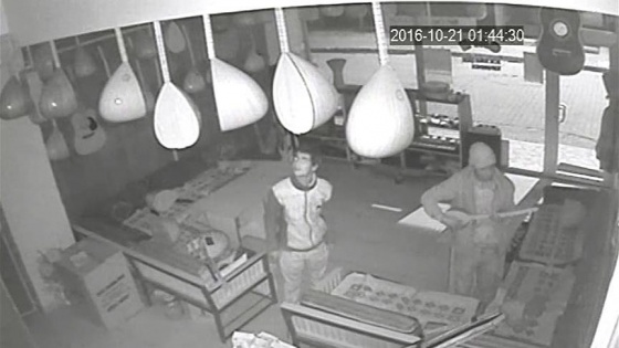 Görüntülerde, iş yerinin önüne gelen iki zanlı, uzun uğraş sonucu kapıyı açıp içeri giriyor. Zanlıların, çalacakları bağlamaları test ettiği de görülüyor. Çaldıkları müzik aletleriyle iş yerinden ayrılacakları sırada güvenlik kamerasını fark eden zanlılar, kamerayı yerinden söküyor.