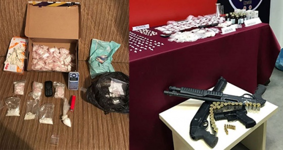 Narkotik Suçlarla Mücadele Şube Müdürlüğü tarafından İzmir genelinde uyuşturucu madde ticareti yapan şahıs, organizasyonların tespiti ve yakalanmasına yönelik yapılan çalışmalar kapsamında; Buca, Konak ve Urla ilçelerinde 1 Kasım tarihinde, önceden tespit edilen bazı sokak, park ve bahçelerde operasyon yapıldı. Operasyonda E.S. (28), A.A. (22), S.Y. (21), N.B. (18), C.A. (39), O.Ç. (25), Ü.S. (35), E.A. (42) ve C.S. (22) yakalandı. Söz konusu adreslerde yapılan aramalarda 25 kök Hint keneviri bitkisi, 280 gram esrar maddesi, satışa hazır hale getirilmiş 92 adet kilitli şeffaf poşet içerisinde 15 gram sentetik kannabinaid (bonzai), poşet içerisinde 35 gram taş kokain ve 25 gram toz kokain, meşe tabir edilen satışa hazır hale getirilmiş 75 kağıt paket içerisinde 55 gram taş kokain, satışa hazır hale getirilmiş 440 adet kilitli şeffaf poşet içerisinde 270 gram taş kokain maddesi, A.A.’nın ekiplere yakalanmamak için saklandığı yerde satışa hazır hale getirilmiş 105 adet kilitli şeffaf poşet içerisinde 72 gram taş kokain maddesi, toz kokaini taş kokain haline getirmekte kullanılan 11 adet şişe içerisinde sıvı madde, bir adet ruhsatsız tabanca ve iki adet ruhsatsız av tüfeği, 25 adet av tüfeği fişeği, dokuz adet tabanca fişeği, bir adet şarjör ve bir adet hassas terazi olmak üzere, toplam 432 gram taş kokain maddesi, 25 gram toz kokain maddesi, 280 gram esrar maddesi ve 15 gram sentetik kannabinaid (bonzai) ele geçirildi. E.S., A.A., S.Y., N.B., C.A., O.Ç., Ü.S., E.A. ve C.S. çıkarıldığı mahkeme tarafından tutuklandı.