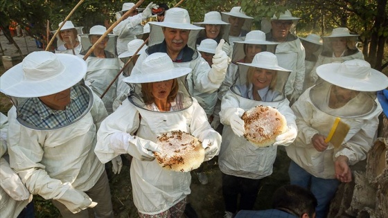 Tur şirketi aracılığıyla kente gelen yerli turistler, bir arıcının üretim sahasında, önce özel kıyafetler giydi, ardından da kovanlardan bal topladı.