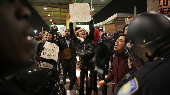 ABD Başkanı Donald Trump'ın Müslüman nüfusa sahip bazı ülke vatandaşlarının ABD'ye girişine ilişkin Başkanlık kararnamesini imzalamasının ardından New York'taki John F. Kennedy Uluslararası Havalimanı'nda 12 kişinin gözaltına alınması protesto edildi.