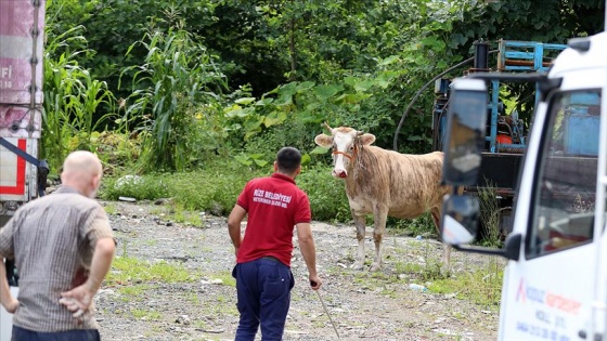 Bahçeye kaçan boğayı yakalayamayan vatandaşlar, Rize Belediyesi kurban ekibinden yardım istedi.