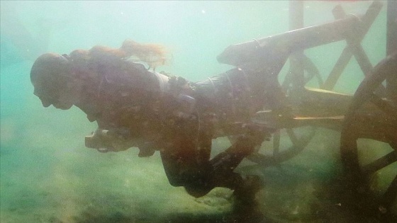 Suyun altındaki 100 kilogramlık kağnıyı çektikten sonra yüzeye çıkan Can, asker selamı verip Türk bayrağı salladı.