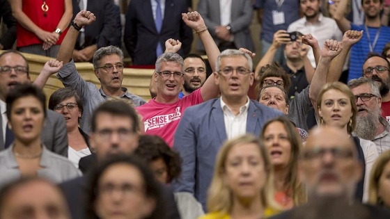 Katalonya parlamentosunda tarihi genel oturumBu arada Katalonya yerel parlamentosunda 72 "evet", 11 "çekimser" ve 1 "hayır" oyuyla kabul edilen referandum yasası, yaklaşık 12 saat süren ve sık sık ara verilen tarihi bir genel oturumu gerçekleştirdi.