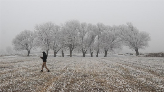 Iğdır'da kırağı tutan ağaç ve bitkiler beyaza büründü.