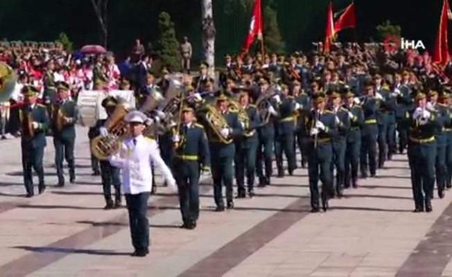 Kırgızistan Silahlı Kuvvetlerinin geçişi sırasında bir araya gelen binlerce Kırgız, İkinci Dünya Savaşı’nda hayatını kaybedenler için saygı duruşunda bulundu.