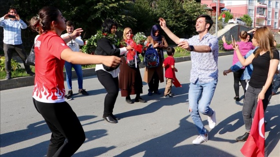 Şampiyon boksör, evinin önünde ailesi ve arkadaşlarıyla birlikte kolbastı ve horon oynayarak mutluluğunu paylaştı.