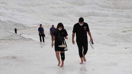 Travertenlerde yürüyen misafirler sık sık fotoğraf çektirdi.